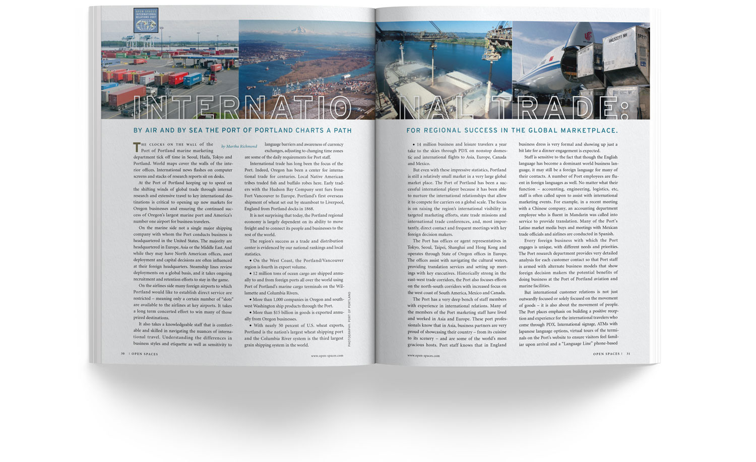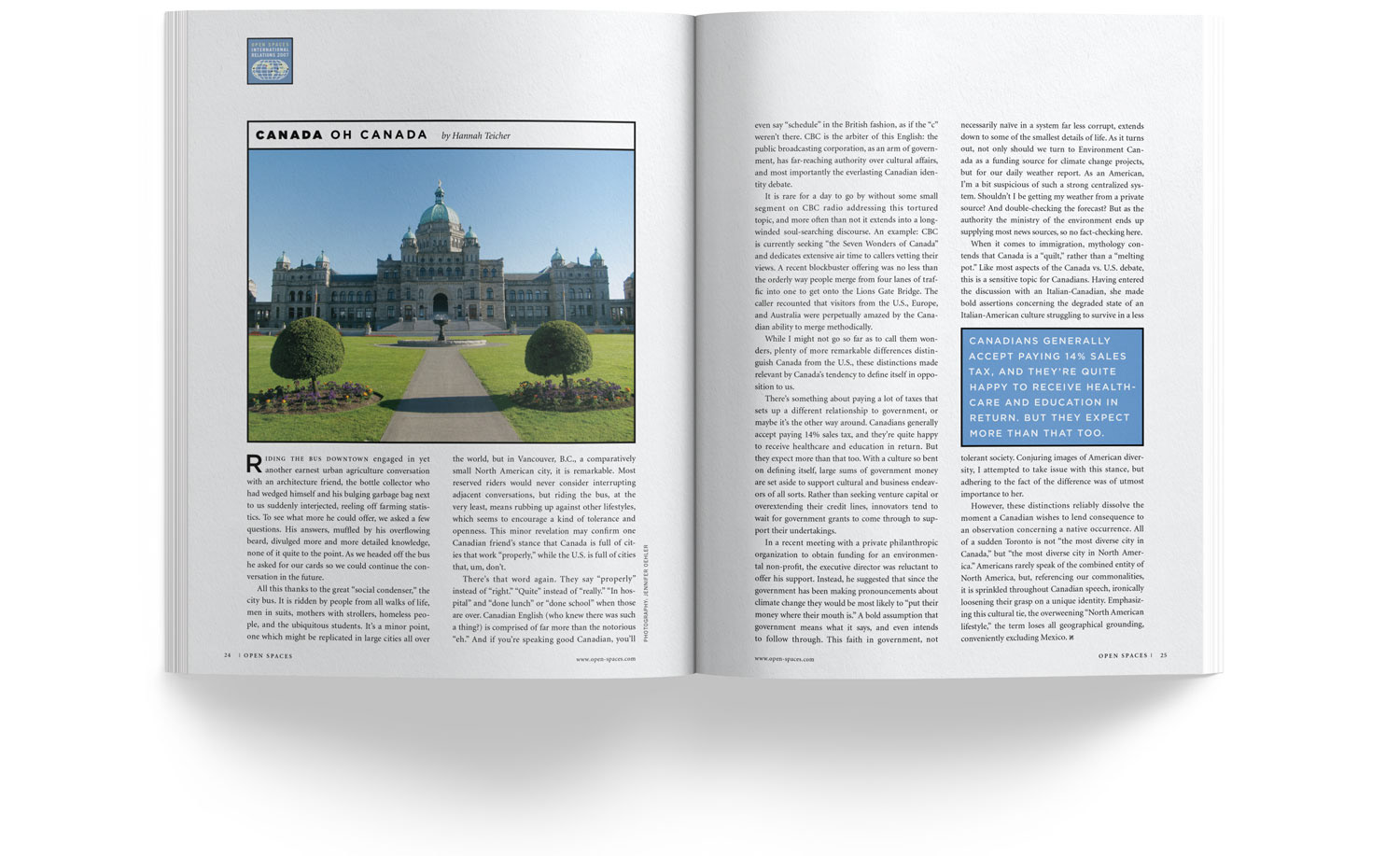 "Open Spaces is a quarterly magazine featuring Northwest voices from a variety of viewpoints. The publication offers well-written, insightful articles on politics, culture, science, music, business, art, education, philosophy, health, food, travel, and gardening, as well as fiction, essays, poetry, and art."